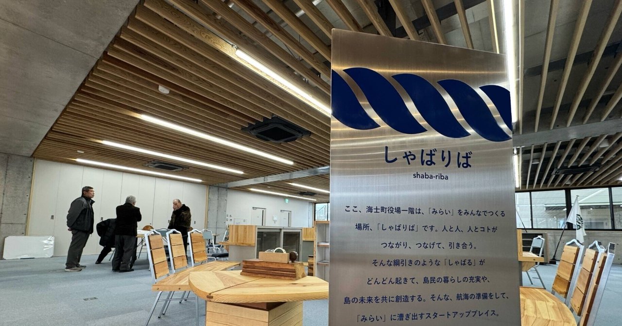 2024年12月に開設された海士町役場内のコミュニティスペース「しゃばりば」は、島民や来訪者の交流の場として幅広く利用されています。趣味の集まりやワークショップ、ちょっとした勉強会など、さまざまな用途で自由に使える場所で、ティータイムコーナーでは一杯50円で飲み物を提供しており、ソファでくつろぎながら過ごすこともできます。