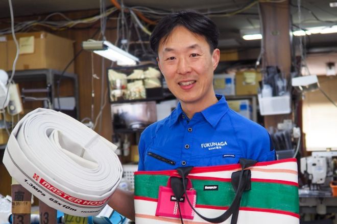 大阪市の縫製加工メーカー・福永は、この消防用ホースを再利用し、トートバッグやペンケースなどに生まれ変わらせています。福永佳久社長は、複雑で硬い素材を扱う熟練の職人で、使い込まれたホースのクセを見極めながら一つひとつ丁寧に仕上げています。