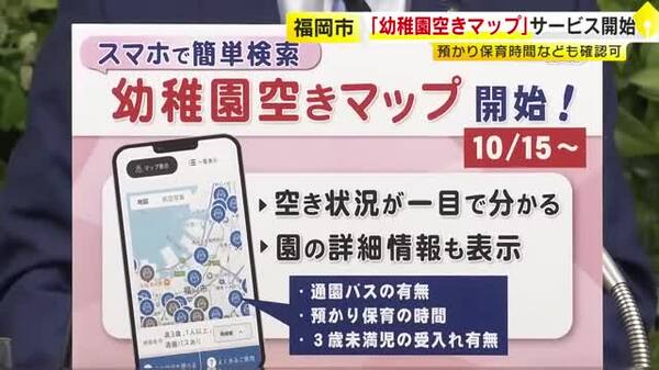 子供の預け先探しに「幼稚園空きマップ」開始 スマホで空き状況をリアルタイム検索 園の詳しい情報も表示 福岡市(テレビ西日本・2025年10月15日)